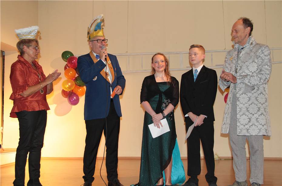 Prinz Jerome der I. mit Pfeil und Bogen und Prinzessin Lena die I. mit Tanz im Blut begrüßten nach der Bekanntgabe das närrische Volk: „Als Prinz und Prinzessin wollen wir euch regieren und glaubt uns, wir wollen uns nicht blamieren. Als Bruder und Schwester nehmen wir das Narrenzepter in die Hand und rauben euch mit unseren Ideen den Verstand. Helau!