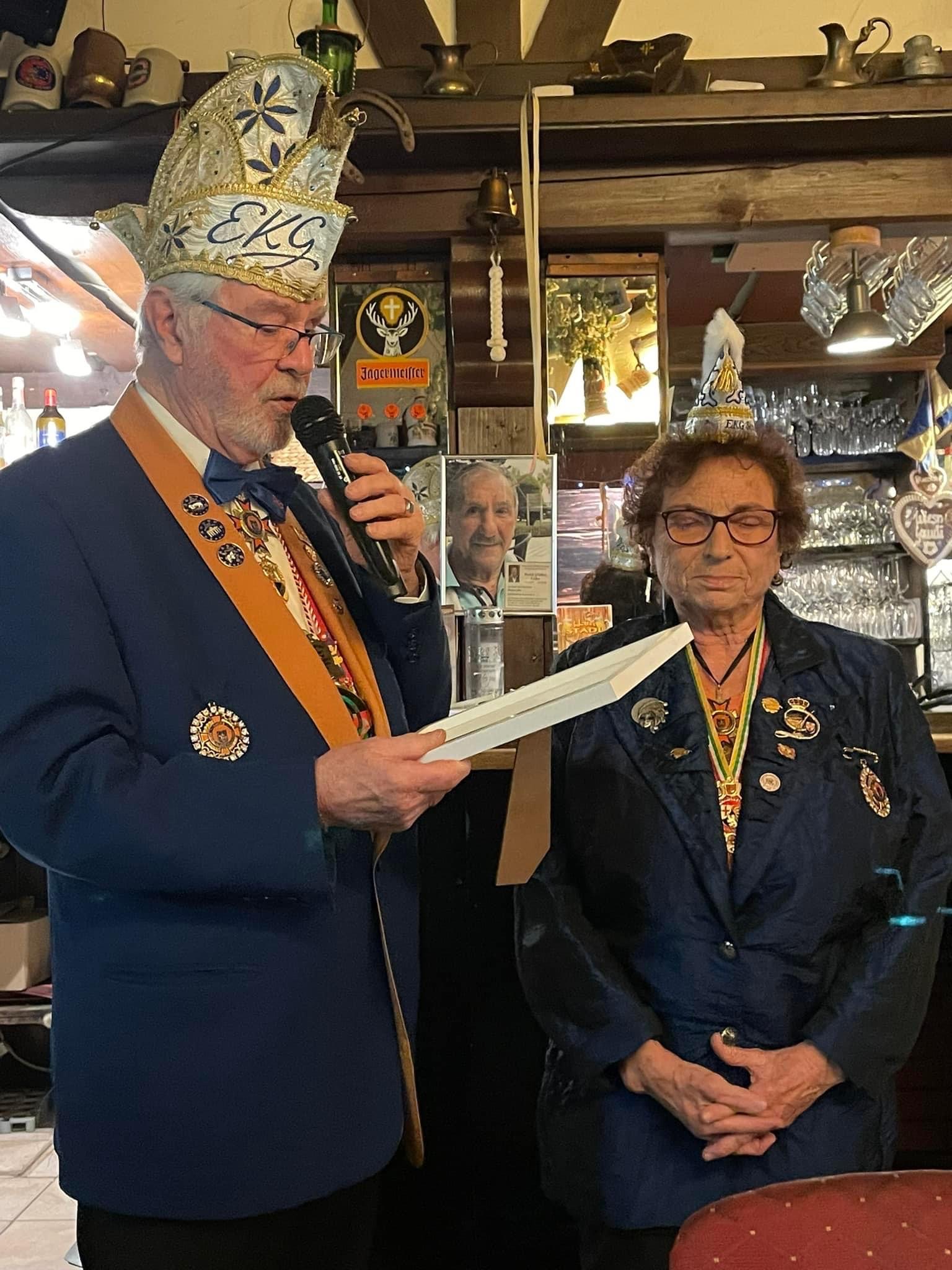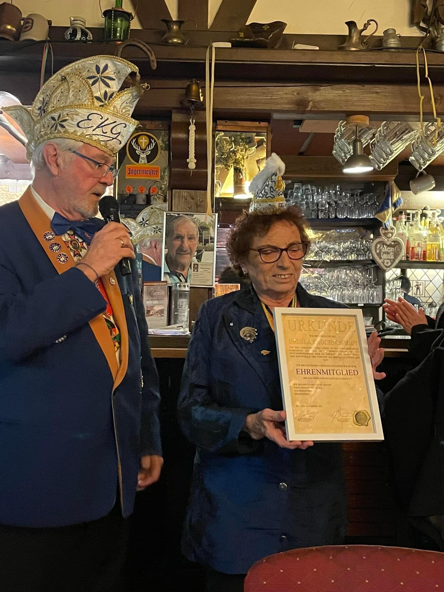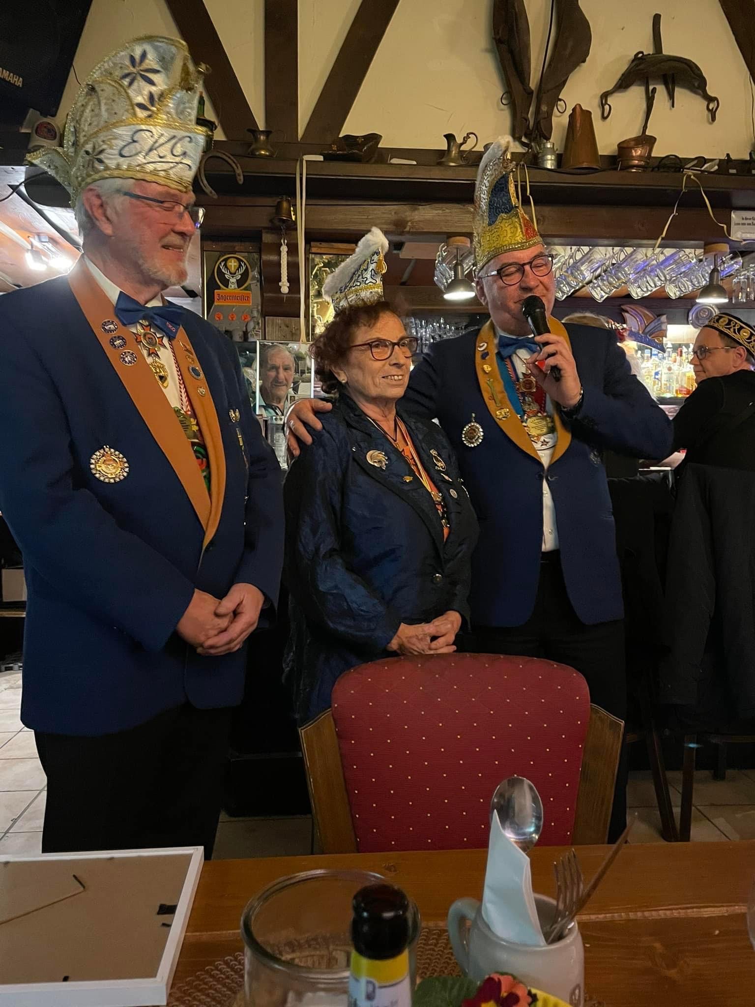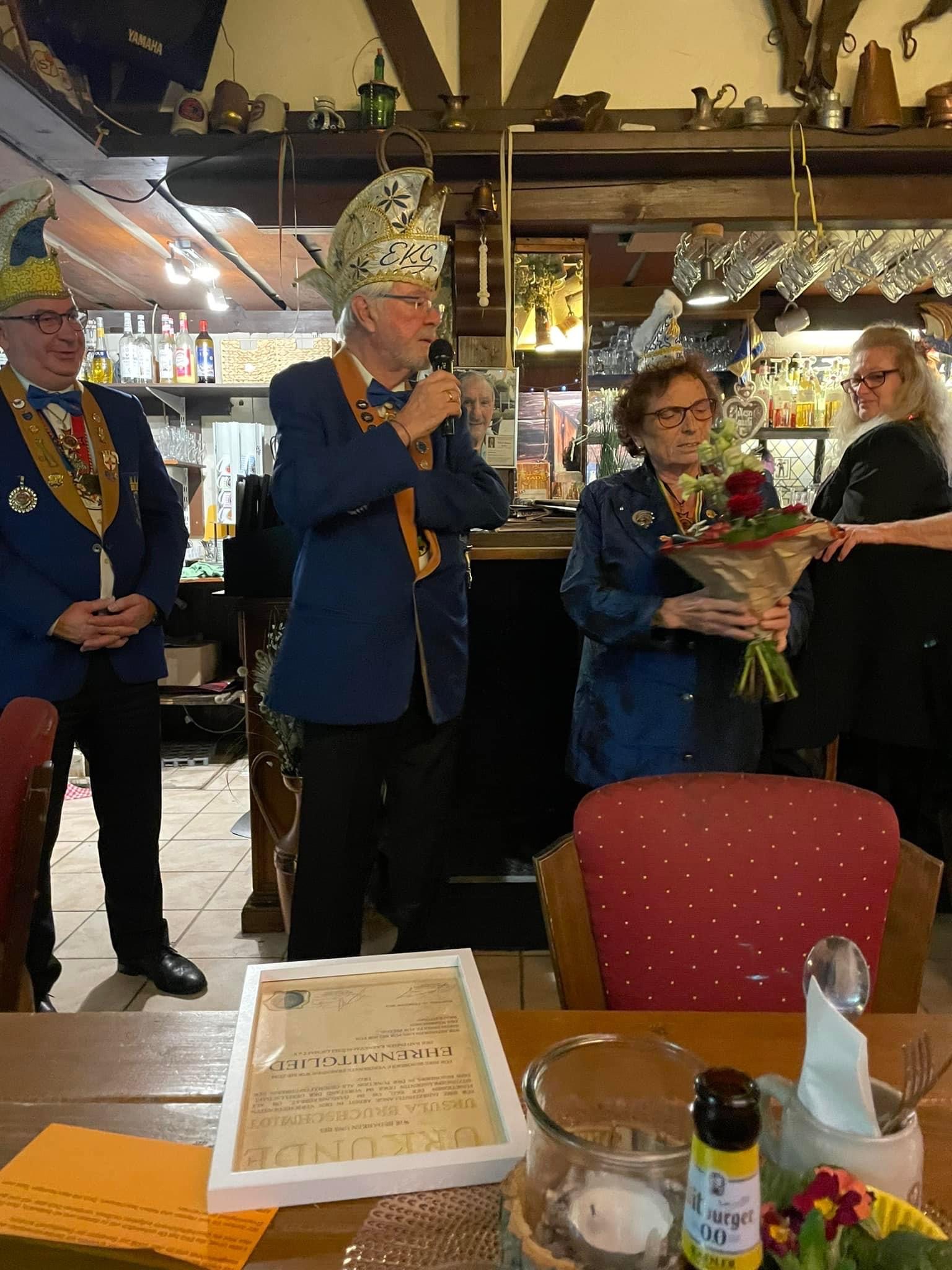 Unsere Senatorin Ursula Bruchschmidt wurde beim heutigen Karnevalsausklang für 44jährige Mitgliedschaft in der EKG geehrt. Aber es ging noch weiter: für ihre fast 30 jährige Arbeit als Geschäftsführerin der Gesellschaft, Jahrzehnte lange Mitgliedschaft im Damenelferrat, langjährige Sitzungspräsidentin und vieles mehr wurde sie zum Ehrenmitglied ernannt.